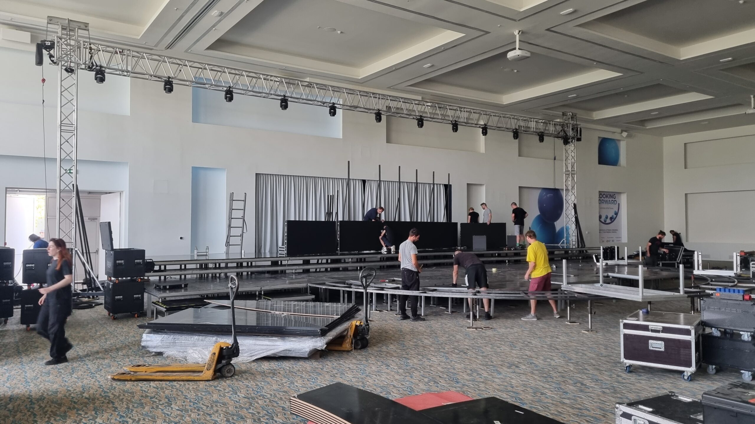 • Modular aufgebaute Systeme für Bühne, Licht, Ton und Bestuhlung
