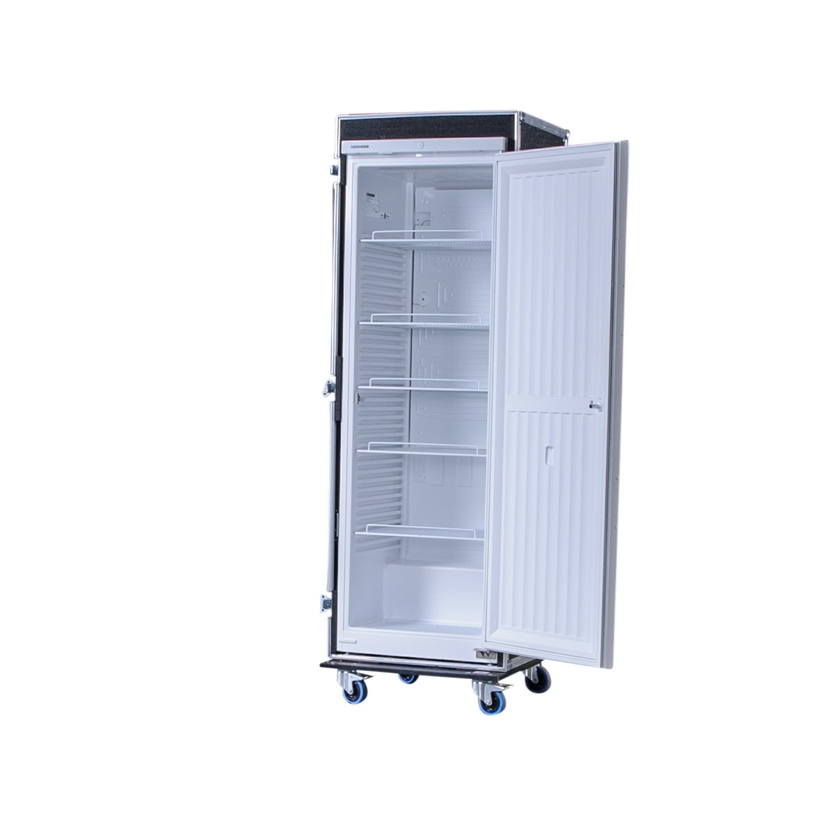 Hochwertiger Lebensmittelkühlschrank mit 395L Nutzinhalt und 5 Ablagefächern. Der Kühlschrank kommt im praktischen Rollcase und kann während des Betriebs im Case verbleiben. Es bestehen Lüftungsöffnungen und ein Zugang zur Stromversorgung.