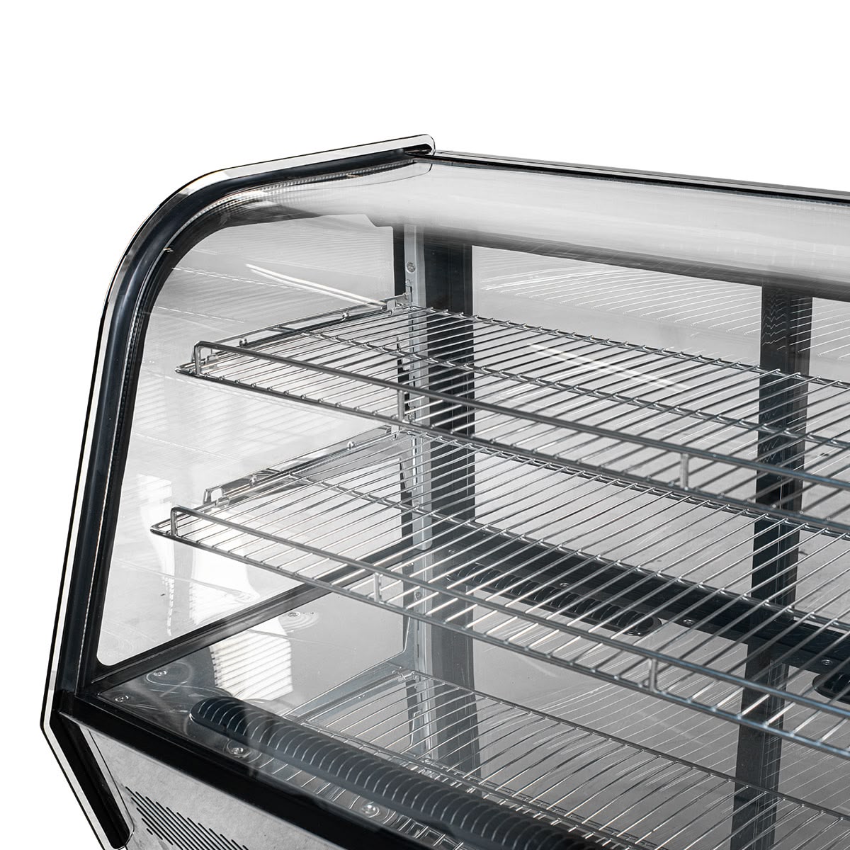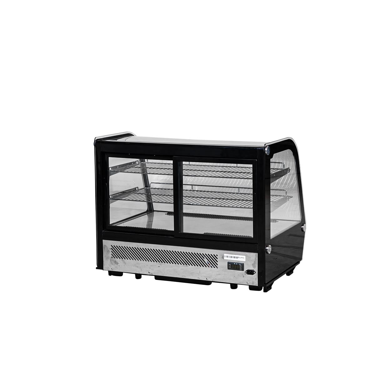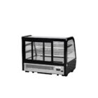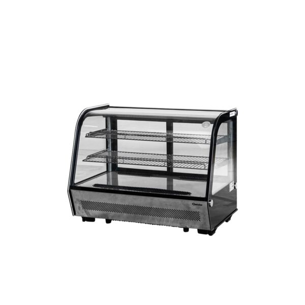 Umluftkühlvitrine mit zwei Lüftern und Doppelverglasung. Der Temperaturbereich liegt zwischen 2°C bis 12°C.