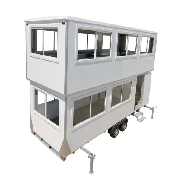 Platz² ist das Motto unseres Skyliners. Trotz seiner enormen Größe kann der Anhänger immer noch mit einem PKW verfahren werden. Im unteren Bereich lassen sich z.B. ein Aufenthalts- oder Besprechungsraum einrichten oder Arbeitsplätze für mehrere Mitarbeiter. Der obere Bereich mit seinen großen Fenstern und einer fast vollständigen Rundumsicht eignet sich z.B. sehr gut für die Arbeitsplätze von Punktrichtern, Rennleitungen, Behördenzentralen oder einfach als ganz besonderer mobiler Besprechungsraum.