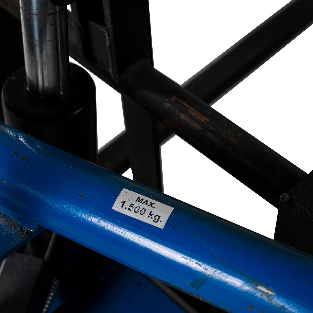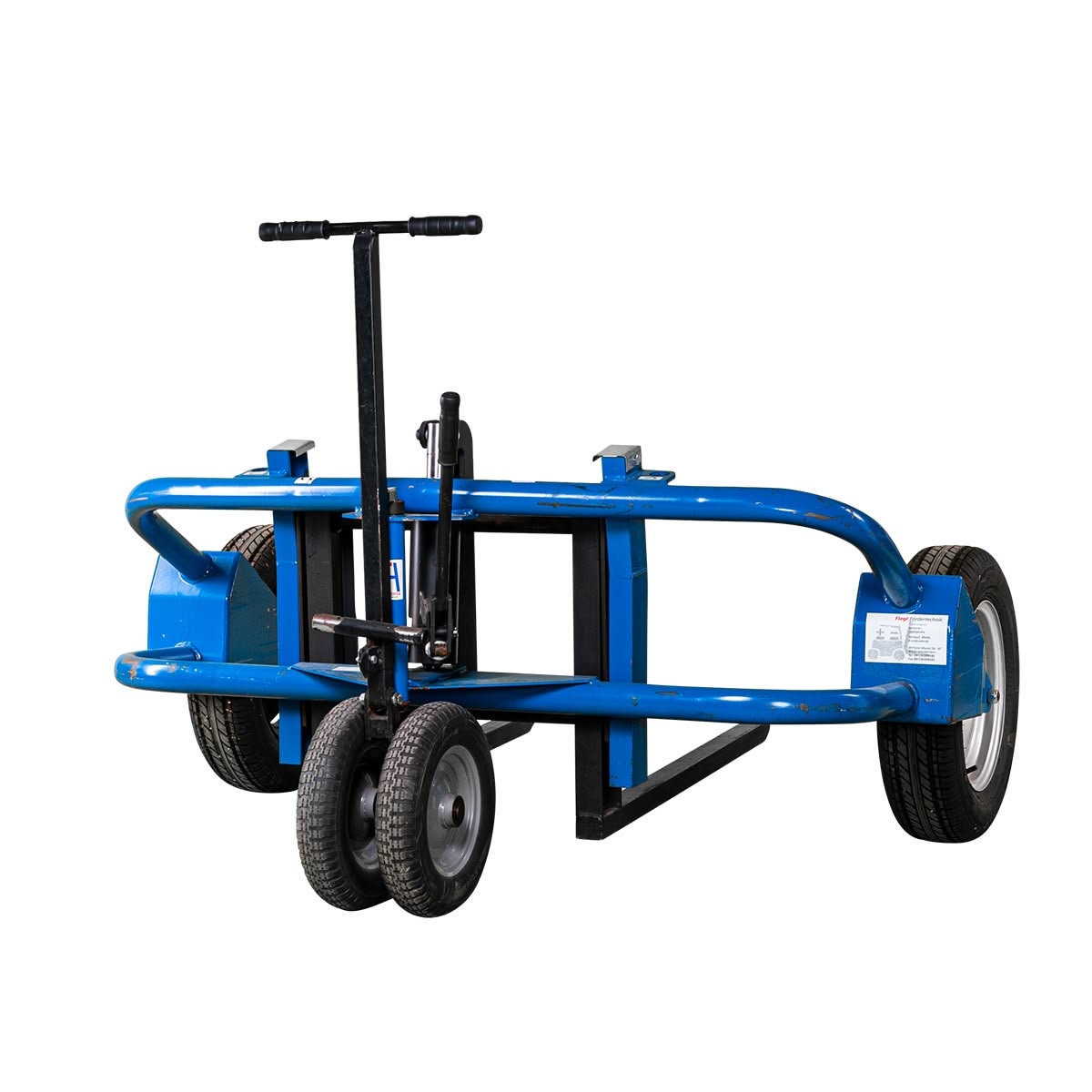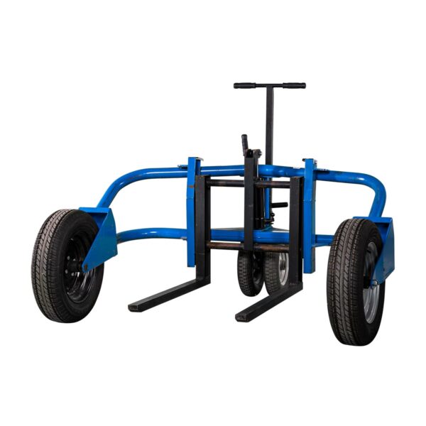 Großer Geländehubwagen mit Hydraulikhandpumpe und großen Luftreifen, um Lasten bis 1500 kg auch in rauem Gelände von Hand befördern zu können. Passend für Europaletten.