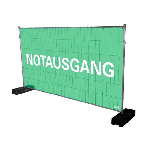 Mobilzaunbanner mit Piktogramm „Notausgang“.