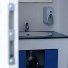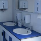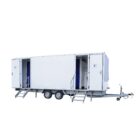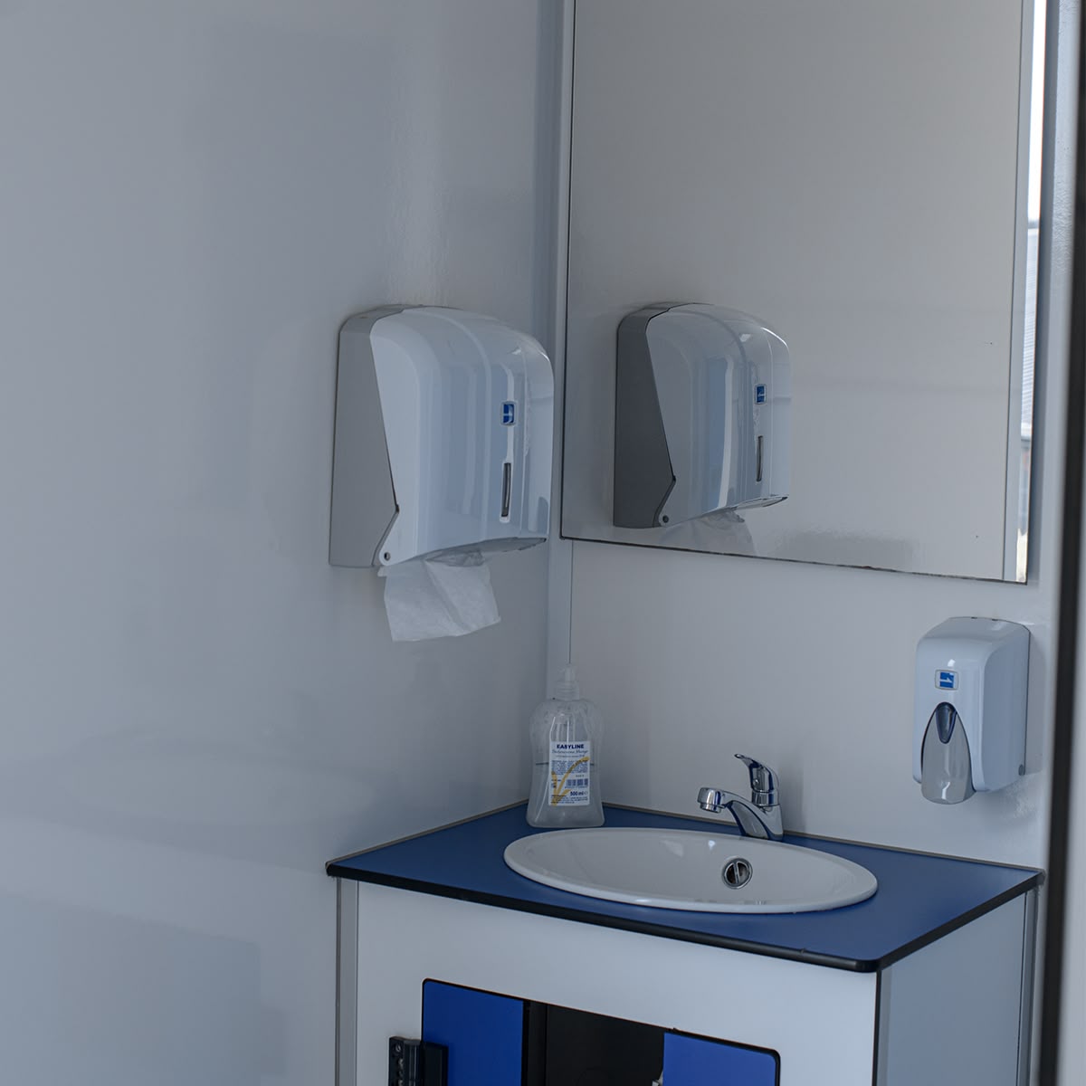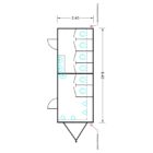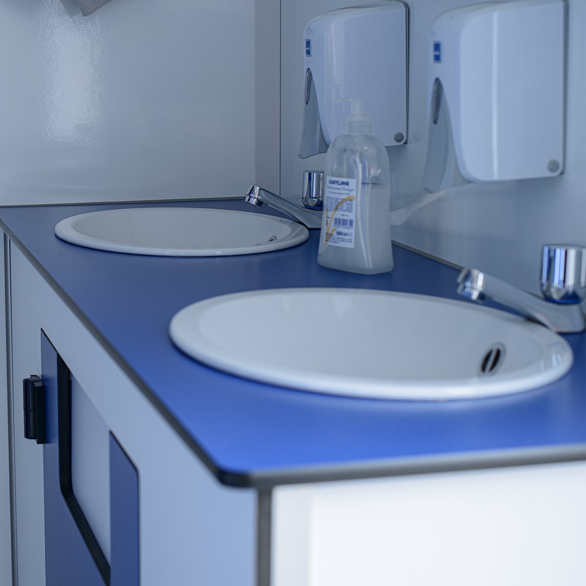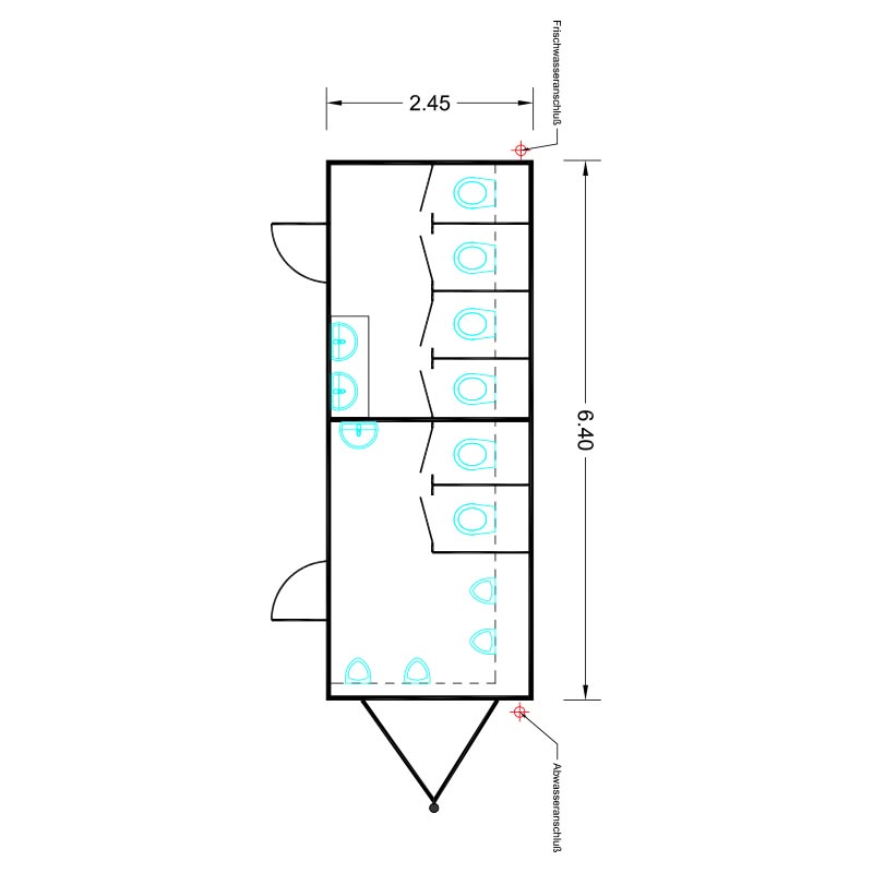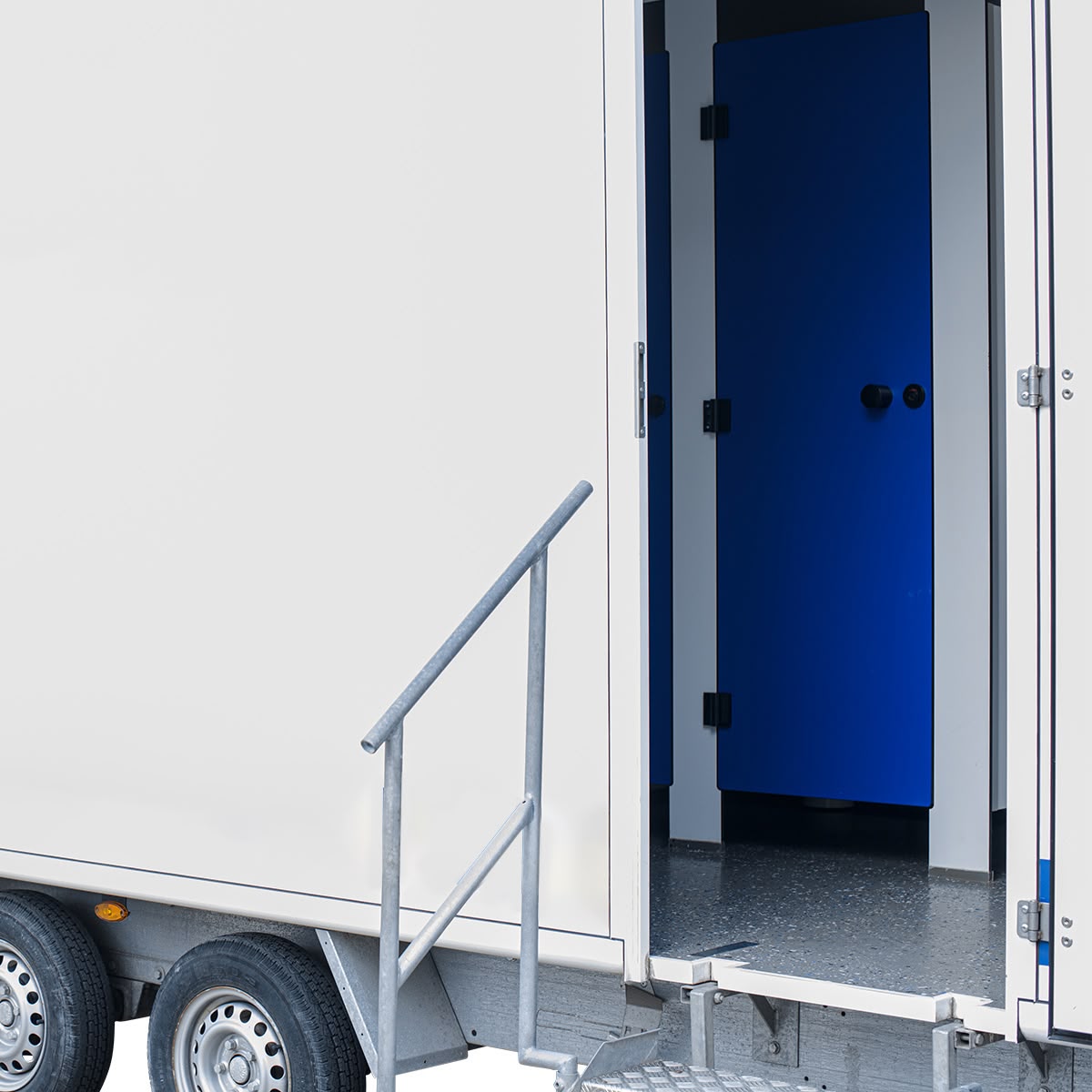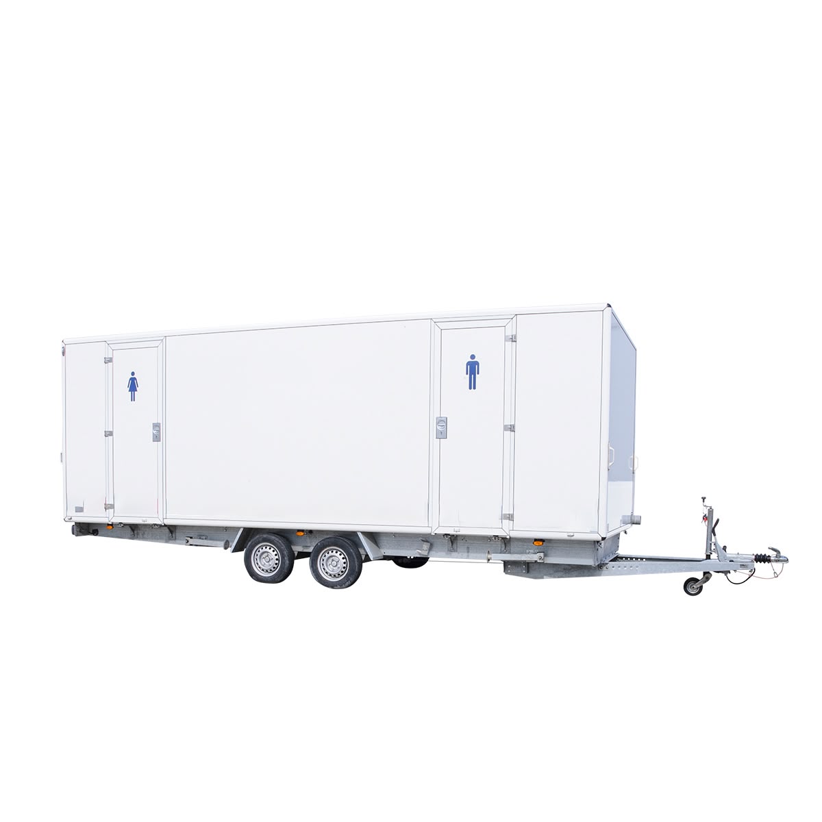 Unser großer Toilettenanhänger verfügt über zwei getrennte Zugänge, jeweils zu einem Damen- und einem Herrenbereich. Der Damenbereich ist mit vier WC-Kabinen und zwei Waschbecken ausgestattet. Unter den beiden Waschbecken befindet sich ein praktischer Unterschrank, in dem Verbrauchsmaterial wie Papierhandtücher, Flüssigseife und Toilettenpapier Platz findet. Über den Waschbecken sind zwei große Spiegel angebracht. Der Herrenbereich ist mit zwei WC-Kabinen, vier Pissoirs und einem Waschbecken ausgestattet. Auch hier befindet sich unter dem Waschbecken ein praktischer Unterschrank und ein Spiegel an der Wand. Beide Bereiche sind auch mit Lüftungen und zwei E-Heizung ausgestattet.