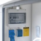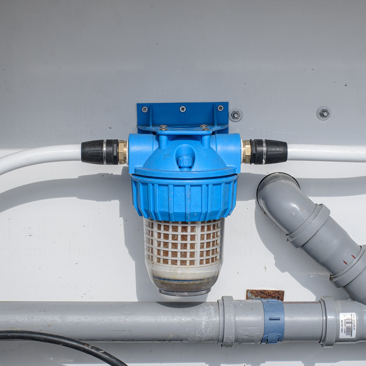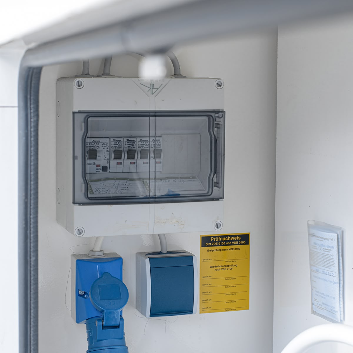 Im Staukasten auf der Rückseite des Anhängers befinden sich Frischwasserfilter und der Sicherungskasten, zudem befindet sich hier auch eine Wasseruhr.