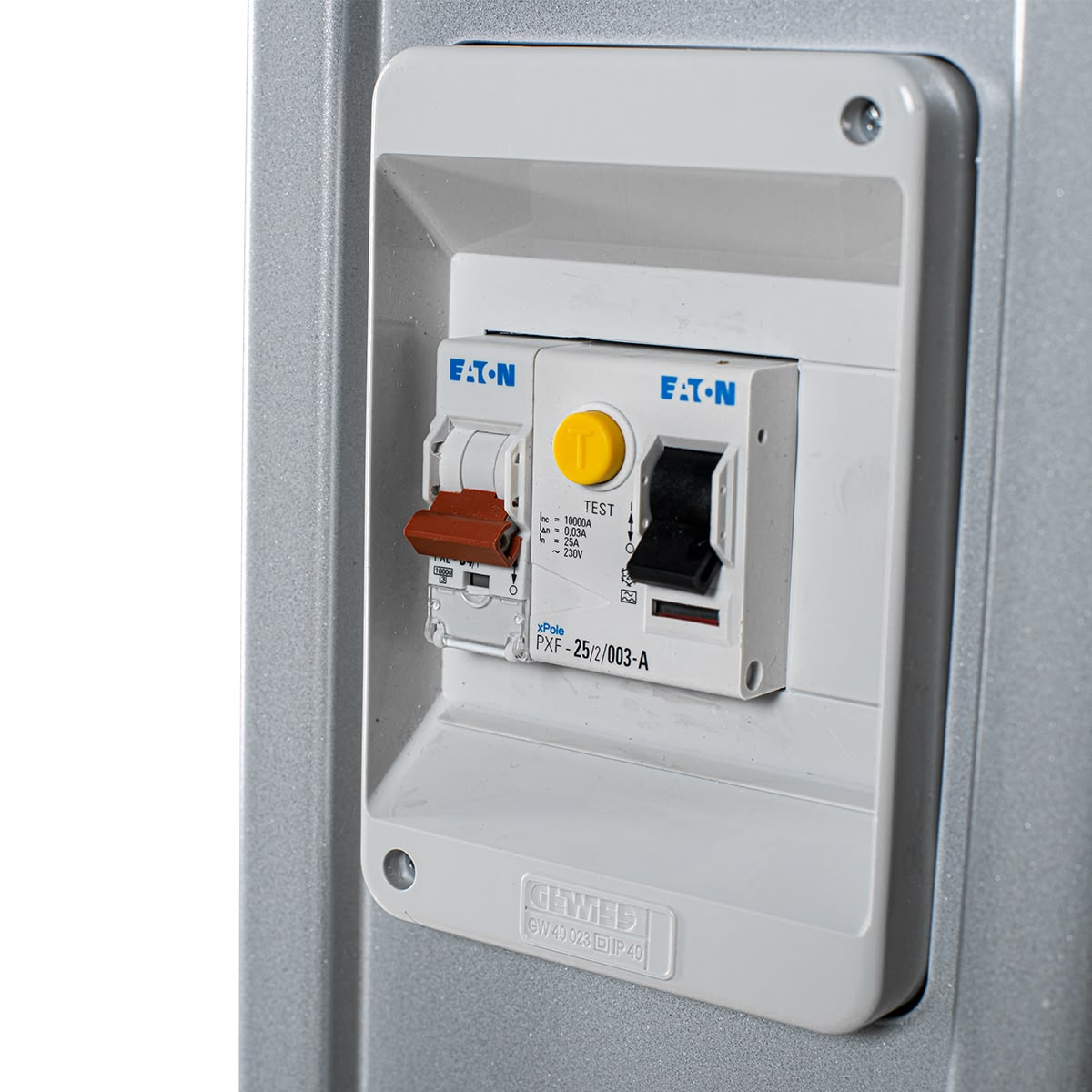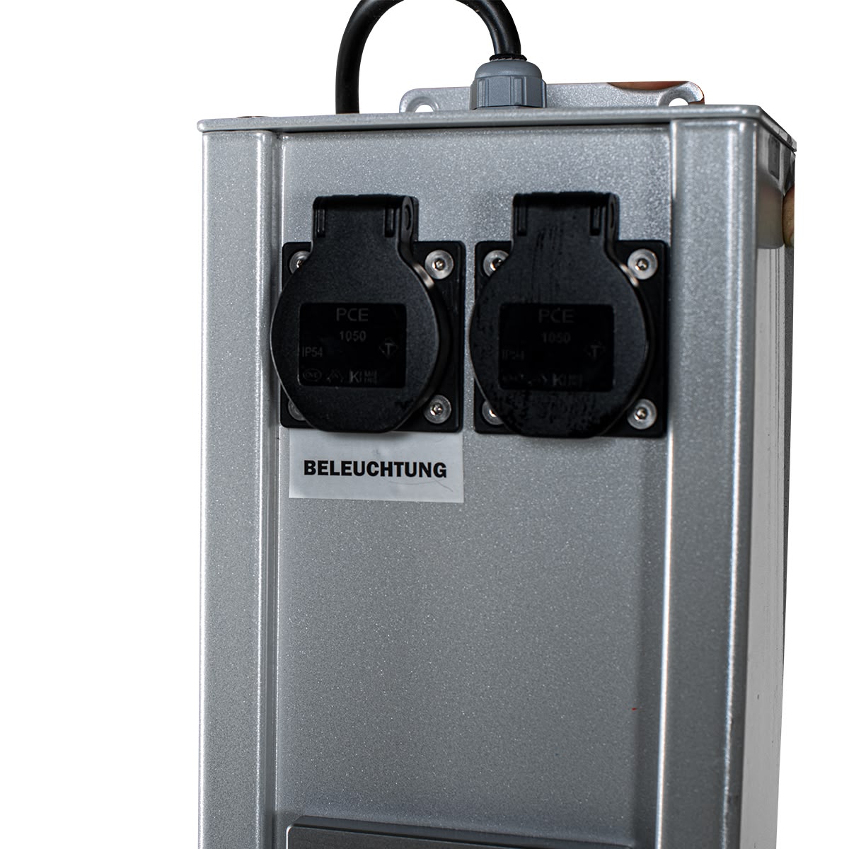 Die Stromsäule limitiert die Leistung auf eine Gesamtleistung von 1200W und wartet mit einer 6A Absicherung auf.