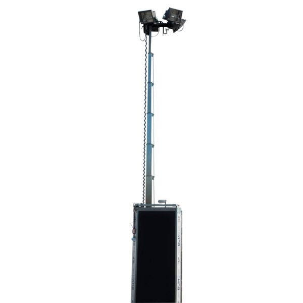 Die vier leistungsstarken HDI Metalldampfstrahler liefern eine extrem hohe Lichtausbeute von 360.000 Lumen. Dank des spasamen Aggregats kommt der Lichtmast auf eine Einsatzdauer von ca. 170h mit einer Tankfüllung. Zum Schutz der Umwelt ist der Lichtmast mit einem Auffangbehälter ausgestattet, der im Falle eine Leckage austretenden Kraftstoff auffängt. Dank des verbauten Schallschutzes kommt der Lichtmast auf lediglich 65db Schalldruck im laufenden Betrieb. Wer ganz auf die Verwendung des Aggregats verzichten möchte, kann die Energieversorgung auch kabelgebunden über einen 32A-Stecker gewährleisten. Als zusätzliches Sicherheitsfeature verfügt der Lichtmast über einen Windsensor. Dieser gibt der Hydraulik ab einer Windgeschwindigkeit von 80km/h ein Signal und der Mast wird automatisch eingefahren.