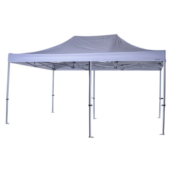 Durch das Scherensystem der bespannten Dachfläche und den einzeln ausziehbaren Füßen ist das Faltzelt in wenigen Minuten zu zweit aufzubauen und einsatzbereit.